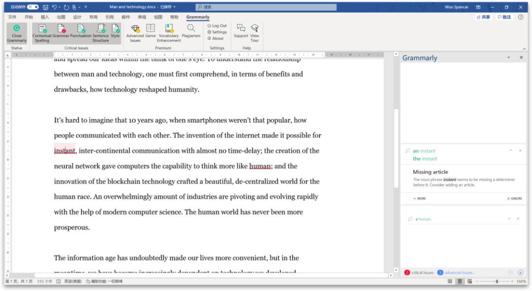 Grammarly 是一家专门对文档、论文等学术文章进行语法、语义和词法检查的公司。其对英语文献的语法检查效果可以说是精准、到位,比 Word 原生的语法检查好上不少。即使是免费版本的 Grammarly 账户,都能够及时准确的为你找到文章中的语法错误。