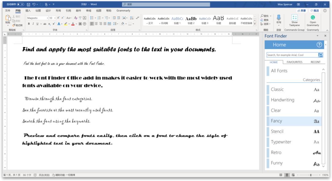 Font Finder 也是由微软官方发布的字体插件。这个插件直接集成了很多有趣的英文字体,分为经典、手写、清晰、华丽等七类,供我们选择。就算我们电脑本身并没有安装这个字体,Font Finder 插件也可以帮助我们直接使用这个字体。不过,遗憾的是,Font Finder 里面集成的字体几乎都是英文字体。也就是说,很多华丽的中文字体,我们并没有途径直接用 Font Finder 使用。