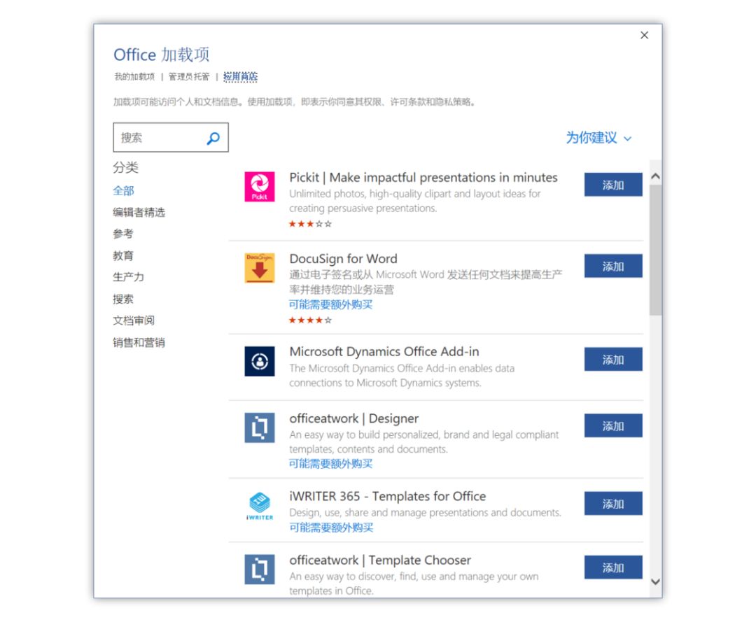 在 Office 应用中下载的插件会随你登录 Office 时使用的微软账户同步,一处下载,处处安装。点击「获取加载项」,我们就可以看到 Office 插件商店,在这里我们就可以直接搜索下文推荐的插件,并直接安装到本机 Office 应用之中。