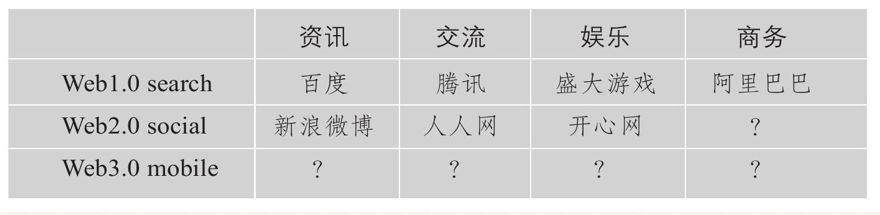 2009年底,王兴曾提出了“四纵三横”理论,其中的“四纵”指的是行业(资讯、交流、娱乐、商务),“三横”指的阶段(1.0 搜索、2.0社交、3.0手机)。在他看来,当时正处2.0的社交时代,资讯、交流、娱乐领域已经有人做了开拓,而商务领域还没有。这就是留给美团的机会,2010年初,团购网站美团网上线。