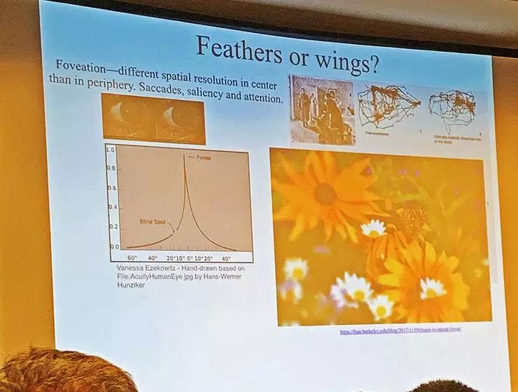 接下来 Bill Freeman 花时间和听众一起讨论了许多视觉系统概念的辨析,大家交换了一下看法。鸟类能够飞行,当时有人认为是因为鸟有羽毛,也有人认为是鸟有翅膀。现在当然公认翅膀才是对飞行来说真正重要的,羽毛不一定需要。他希望大家思考一下,后面的这些概念,对视觉系统来讲哪些是翅膀、哪些是羽毛。也藉由这些讨论,窥探未来计算机视觉研究有待探究的课题。