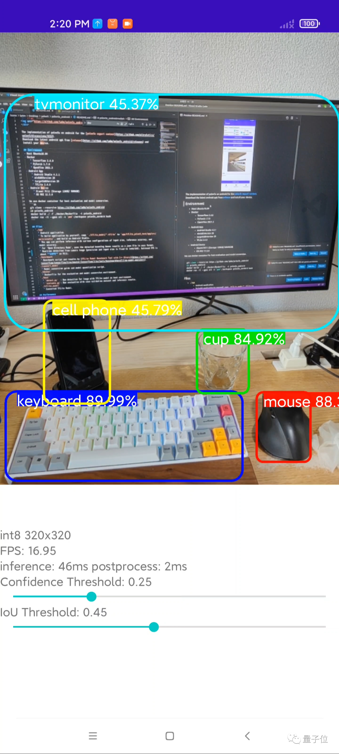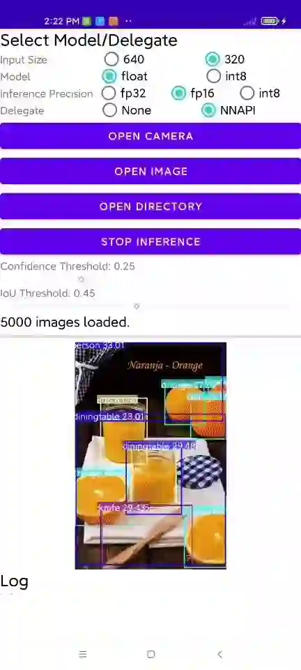 从摄像头进行实时检测模式已将精度和输入图像大小固定为int8/320,该模式在小米11达到的图像帧数为15FPS。