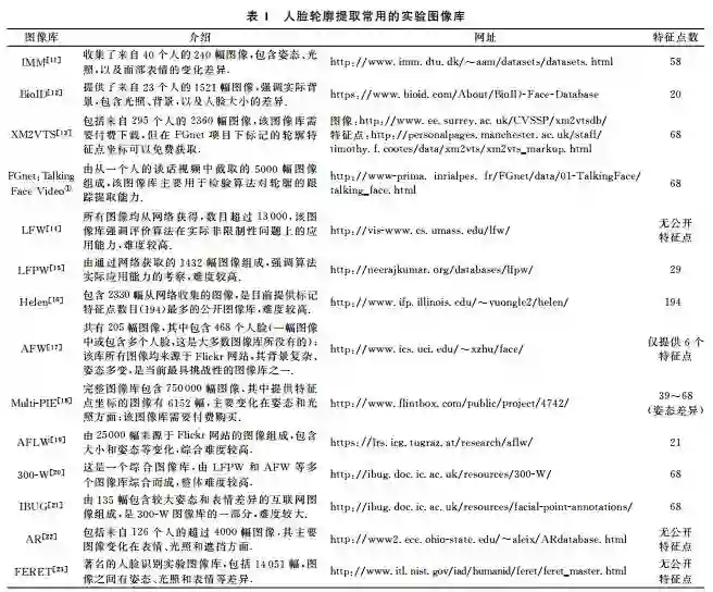 传统人脸关键点检测数据库为室内环境下采集的数据库,比如 Multi-pie、Feret、Frgc、AR、BioID 等人脸数据库。而现阶段人脸关键点检测数据库通常为复杂环境下采集的数据库.LFPW 人脸数据库有 1132 幅训练人脸图像和 300 幅测试人脸图像,大部分为正面人脸图像,每个人脸标定 29 个关键点。AFLW 人脸数据库包含 25993 幅从 Flickr 采集的人脸图像,每个人脸标定 21 个关键点。COFW 人脸数据库包含 LFPW 人脸数据库训练集中的 845 幅人脸图像以及其他 500 幅遮挡人脸图像,而测试集为 507 幅严重遮挡(同时包含姿态和表情的变化)的人脸图像,每个人脸标定 29 个关键点。MVFW 人脸数据库为多视角人脸数据集,包括 2050 幅训练人脸图像和 450 幅测试人脸图像,每个人脸标定 68 个关键点。OCFW 人脸数据库包含 2951 幅训练人脸图像(均为未遮挡人脸)和 1246 幅测试人脸图像(均为遮挡人脸),每个人脸标定 68 个关键点。