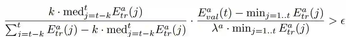 针对多任务学习的另外一个问题——各任务收敛速度不同,本文提出一种新的提前停止(Early Stopping)方法。当某个子任务达到最好表现以后,这个子任务就对主任务已经没有帮助,就可以停止这个任务。文章给出自动停止子任务的计算公式,如下: