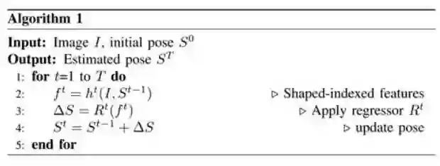 ,其中 K 表示关键点的个数,由于每个关键点有横纵两个坐标,所以 S 得长度为 2K。CPR 检测流程如图所示,一共有 T 个阶段,在每个阶段中首先进行特征提取,得到, 这里使用的是 shape-indexed features,也可以使用诸如 HOG、SIFT 等人工设计的特征,或者其他可学习特征(learning based features),然后通过训练得到的回归器 R 来估计增量ΔS( update vector),把ΔS 加到前一个阶段的 S 上得到新的 S,这样通过不断的迭代即可以得到最终的 S(shape)。