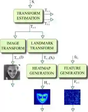 从第一阶段开始讲起,第一阶段的输入仅有原始图片和 S0。面部关键点的初始化即为 S0,S0 是由所有关键点取平均得到,第一阶段输出 S1。对于第二阶段,首先,S1 经第一阶段的 CONNECTION LAYERS 进行转换,分别得到转换后图片 T2(I)、S1 所对应的热图 H2 和第一阶段 fc1 层输出,这三个正是第二阶段的输入。如此周而复始,直到最后一个阶段输出 SN。文中给出在数据集 IBUG 上,经过第一阶段后的 T2(I)、T2(S1)和特征图,如图所示: