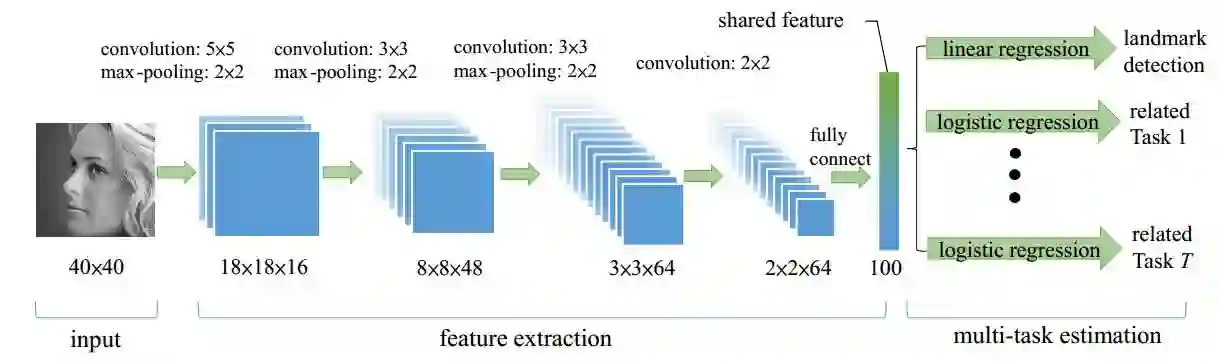 网络输出为 40*40 的灰度图,经过 CNN 最终得到 2*2*64 的特征图,再通过一层含 100 个神经元的全连接层输出最终提取得到的共享特征。该特征为所有任务共同享用,对于关键点检测问题,就采用线性回归模型;对于分类问题,就采用逻辑回归。
