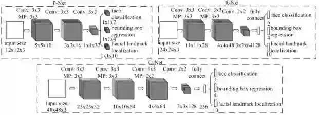 2016 年,Zhang 等人提出一种多任务级联卷积神经网络(MTCNN, Multi-task Cascaded Convolutional Networks)[9] 用以同时处理人脸检测和人脸关键点定位问题。作者认为人脸检测和人脸关键点检测两个任务之间往往存在着潜在的联系,然而大多数方法都未将两个任务有效的结合起来,本文为了充分利用两任务之间潜在的联系,提出一种多任务级联的人脸检测框架,将人脸检测和人脸关键点检测同时进行。