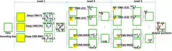 如图所示,DCNN 由三个 Level 构成。Level-1 由 3 个 CNN 组成;Level-2 由 10 个 CNN 组成(每个关键点采用两个 CNN);Level-3 同样由 10 个 CNN 组成。