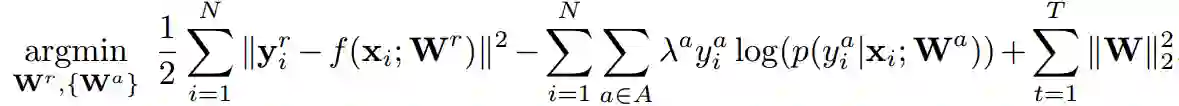 是正则项。可以看到对于各任务 t 而言,其重要性是相同的,但是在多任务学习中,往往不同任务的学习难易程度不同,若采用相同的损失权重,会导致学习任务难以收敛。文章针对多任务学习中,不同学习难度问题进行了优化,提出带权值的目标函数: