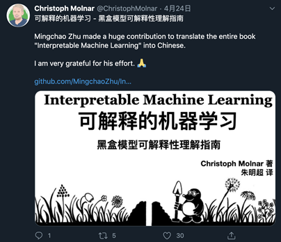 这本书由复旦大学朱明超完成它的翻译和校正工作,目前已经开源放到GitHub网页上,《可解释的机器学习》。作者Christoph Molnar 在其后也发到了推特上。