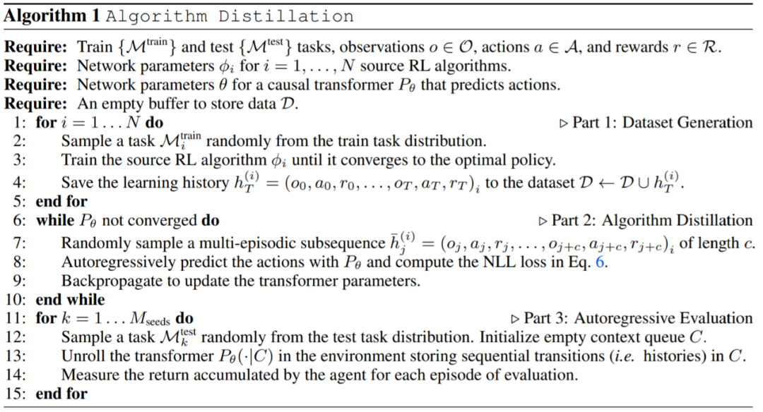 在实践中,该研究将算法蒸馏过程 ( algorithm distillation ,AD)实现为一个两步过程。首先,通过在许多不同的任务上运行单独的基于梯度的 RL 算法来收集学习历史数据集。接下来,训练具有多情节上下文的序列模型来预测历史中的动作。具体算法如下所示: