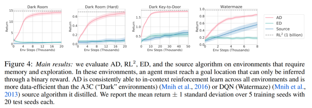 AD 是否可以学习一种比生成源数据的算法更有效的 RL 算法?结果表明 AD 的数据效率明显高于源算法(A3C 和 DQN)。