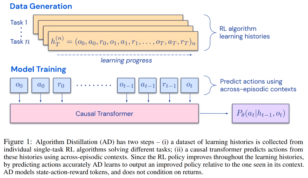 研究者提出了算法蒸馏(Algorithm Distillation, AD),这是一种通过优化 RL 算法学习历史中因果序列预测损失来学习上下文策略改进算子的方法。如下图 1 所示,AD 由两部分组成。首先通过保存 RL 算法在大量单独任务上的训练历史来生成大型多任务数据集,然后 transformer 模型通过将前面的学习历史用作其上下文来对动作进行因果建模。由于策略在源 RL 算法的训练过程中持续改进,因此 AD 不得不学习改进算子以便准确地建模训练历史中任何给定点的动作。至关重要的一点是,transformer 上下文必须足够大(即 across-episodic)才能捕获训练数据的改进。