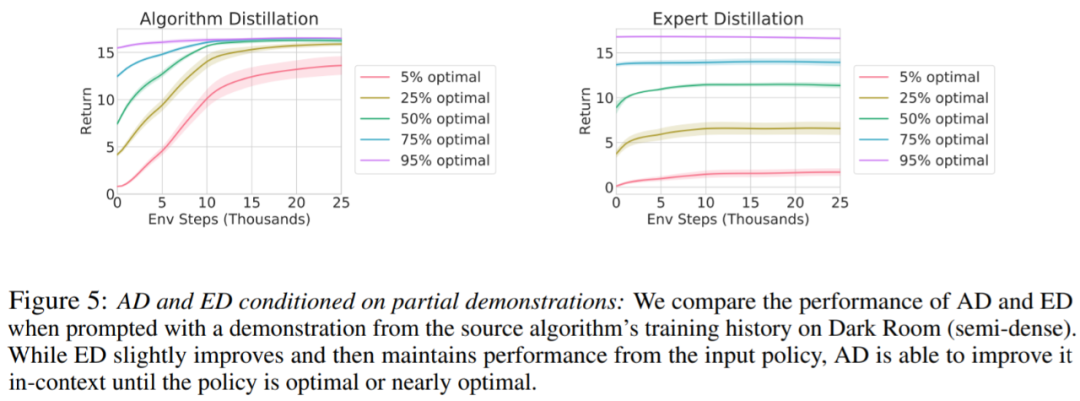 是否可以通过演示来加速 AD?为了回答这个问题,该研究保留测试集数据中沿源算法历史的不同点采样策略,然后,使用此策略数据预先填充 AD 和 ED 的上下文,并在 Dark Room 的环境中运行这两种方法,将结果绘制在图 5 中。虽然 ED 保持了输入策略的性能,AD 在上下文中改进每个策略,直到它接近最优。重要的是,输入策略越优化,AD 改进它的速度就越快,直到达到最优。