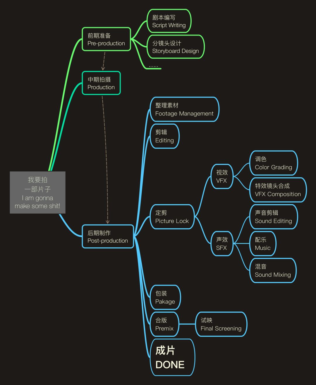 数字影视制作有一个比较复杂的流程,值得高等院校为此开一门专业课。在这里,我试着结合手头上的数字设备,简单地为大家分享我所了解到的流程。下图所述步骤,名词可能经过修改以方便理解,不作权威考究。
