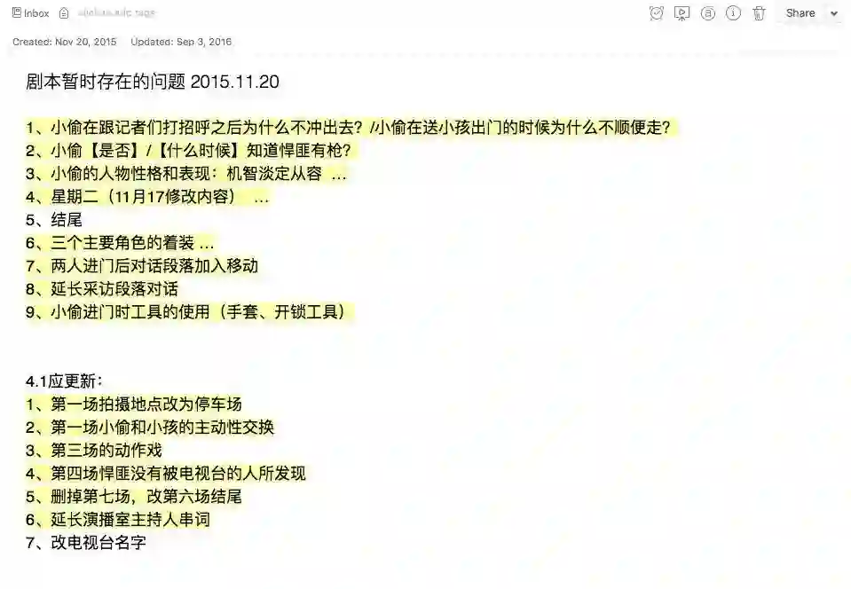 前三个软件前文已经介绍过。但大家知道,剧本写出来肯定不会一稿就过。写完了第一稿意味着马上要进入漫长的修改过程。跟导演、制片、导师等聊完剧本之后,我会用 Evernote 将他们的意见记录,并在电脑前打开,逐一修改并标注。