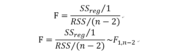 F服从自由度为(1,n-2)的F分布。在检验水平为alpha时,如果F大于F(1,n-2),那么就拒绝原假设,说明回归方程是显著的。另外一个衡量回归方程显著性的是R方也叫拟合优度,判定系数,可决系数,都是一个意思,R方越大,表明回归方程越显著。