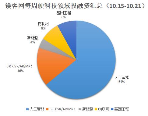 本周(10.15-10.21)硬科技领域投融资事件共25起,其中人工智能领域占比最多,融资事件共16起。3R(VR、AR、MR)领域内有4起融资事件,物联网和基因工程领域分别有2起融资事件,新能源领域则为1起,且还是收购事件。