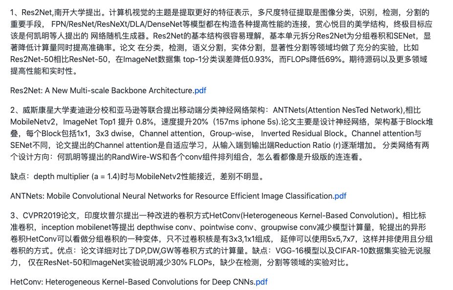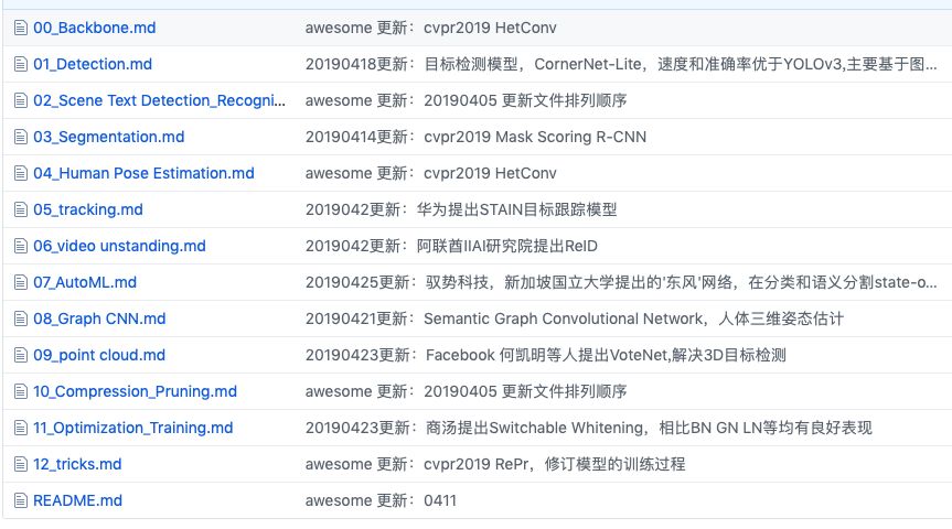 从内容上来看,总共分为12类,包括:Backbone、Detection、场景文本检测、分割、人体姿态评估、Tracking、视频理解、AutoML、Graph CNN、Point Cloud、压缩剪切、优化训练、训练技巧等。