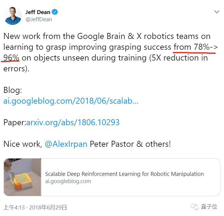 经过4个月的训练后,7位机器人迎来了他们的“考试”:成绩不错,在700次试验中,机器人找东西抓起来的成功率高达96%,比此前监督学习方法78%的成功率提升了很多。