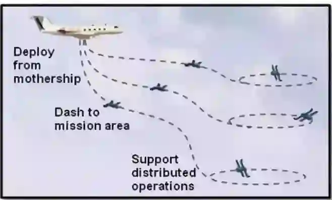 无人机蜂群一般由一组承担不同作战任务的无人机群组成,其执行任务简单的流程如下图所示:由大型运输机作为母船前出至任务区域并释放无人机组,无人机蜂群进行编队并俯冲至任务区域展开协同作战行动,任务完成后返回母船。