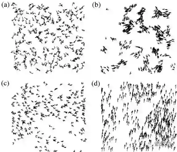 图3 1995年Vicsek提出的粒子群模型,可以看出在一段时间之后所有粒子最终都沿着相同方向运动