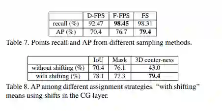 为了更好地探索在 SA 之后被保留下来的有代表性的点,本文提出了一个边框预测网络,包括一个候选生成层(CG)、一个无锚回归头和一个 3D 中心分配策略。在 CG 中,首先用 F-FPS 中有代表性的点生成候选点,这一过程收到这些点以及共现例子中的中心点的相对位置的约束。接下来将这些候选点作为中心,从 F-FPS 和 D-FPS 有代表性的点中选取其周围的点,将其特征通过多层感知网络(MLP),这些特征最终被输入到无锚回归头中来预测 3D 边框。本文还设计了一个 3D 中心分配策略,给候选点中更靠近样本中心的点更高的得分。
