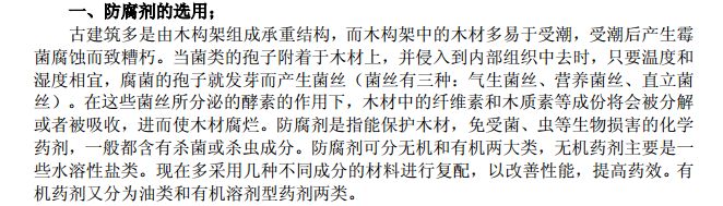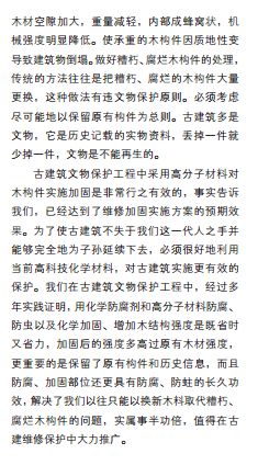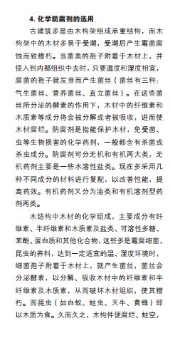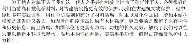 这篇论文读起来有一种强烈的撕裂感,如第一段在持续论述绿色化学的定义与意义,和文章题目或是接下来第二段的化学防腐技术在古建筑保护工程中的应用几乎没有任何联系,两段之间亦无过渡。这种撕裂感在从第二个标题开始的文章主题部分开始变得更为明显。作者大段论述的“绿色化学技术的种类”可以说同文章的主题没有丝毫联系,同后文更没有任何逻辑上的关系。坦率地说,梁同学这篇不足两页的论文中的第一页完全是在复述一些定义。