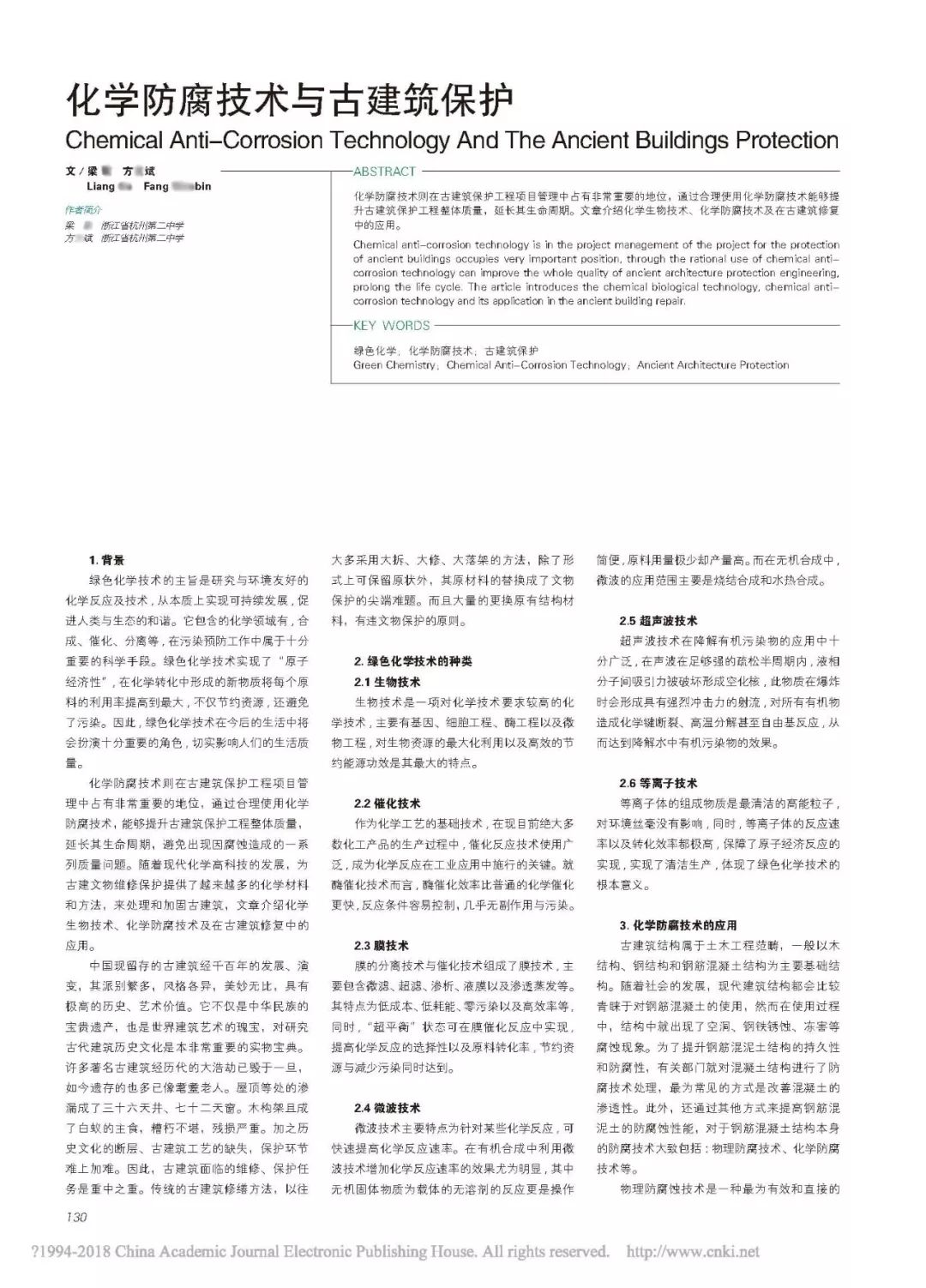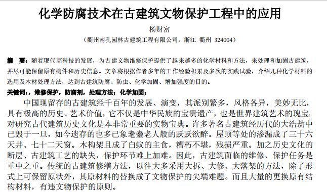 1、杭州市第二中学梁同学与方文斌老师的《化学防腐技术与古建筑保护》(2017年2月发表于《建筑与文化》)