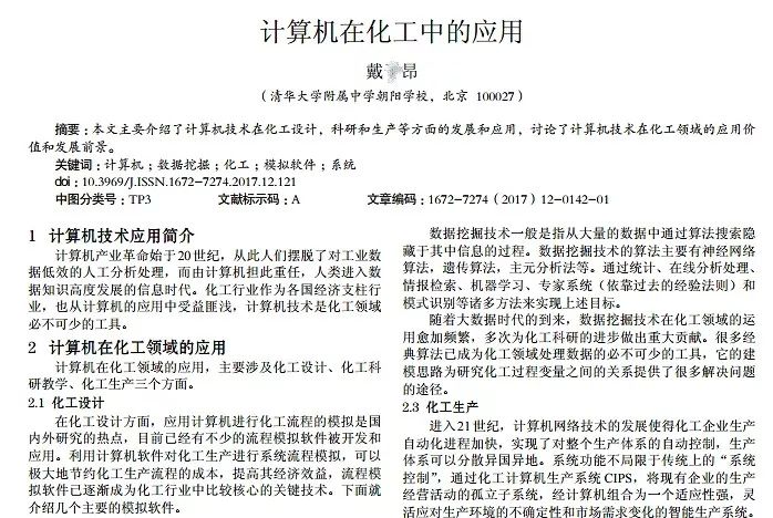 3、清华大学附属中学朝阳学校戴同学的《计算机在化工中的应用》(2017年12月发表于《数字通信世界》杂志)