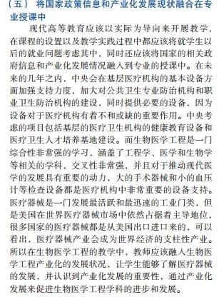 小标题中,该生的论文调换了语序,同时又将“在…基础上增加”这一短语,改为了“融合在”。细节上的改动则是该生抄袭的主要方式,如将“未来三年内”改为“在未来的几年之内”;将“生物医学工程是一门综合了生物、医学、工程学等学科的新兴交叉学科”重新表述为“生物医学工程是一门综合性非常强的学习,涵盖了工程学、医学和生物学等相关学科”;将“小到血压计、大到手术机器人”,改为“大的手术器械和小的血压计”。