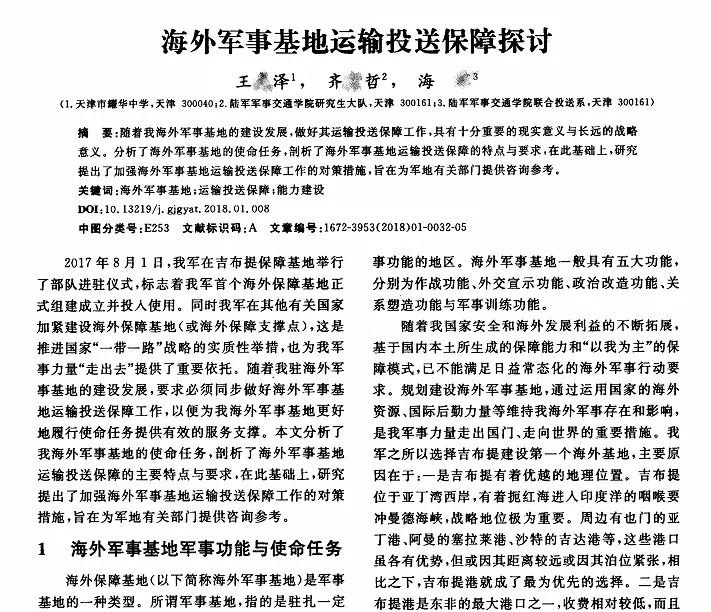 天津市耀华中学王同学与陆军军事交通学院齐文哲、海军的“海外军事基地运输投送保障探讨”(2018年1月发表于《国防交通工程与技术》)