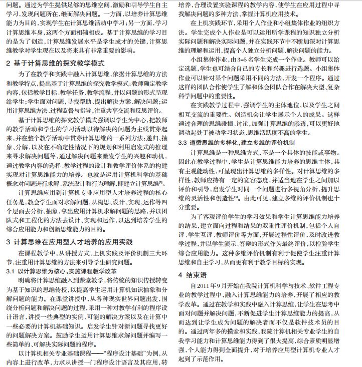 4、电子科技大学实验中学张同学和成都七中肖同学的“计算思维在计算机应用型人才培养中的应用”(2017年8月发表于《电脑迷》)涉嫌抄袭湖北文理学院袁磊等人于2014年2月发表在《计算机时代》的“计算思维在计算机应用型人才培养中的应用探索”。