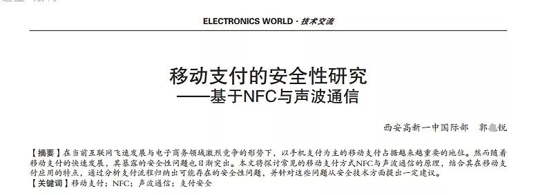 2、西安高新一中郭同学的《移动支付的安全性研究 ——基于NFC与声波通信》(2017年2月发表于《电子世界》)