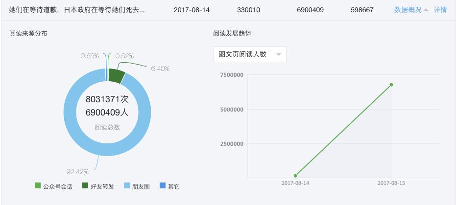 最为人所知的是他们在2017年8月推送的那篇《她们在等待道歉,日本政府在等待她们死去…》。文章意在为当时排片量仅1%的国产电影《二十二》发声,发布两天阅读数就达740万,带来18万涨粉,一时成刷屏爆款。