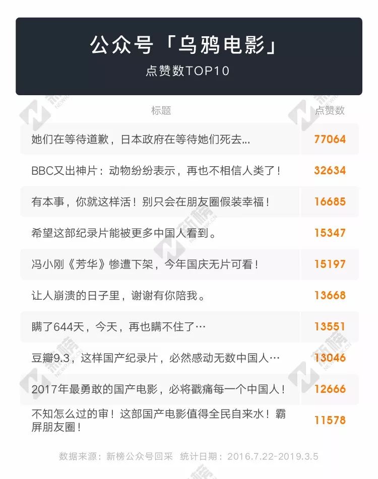 据新榜公众号回采,「乌鸦电影」自2016年7月至今共发文896篇,其中包含511篇10w+。