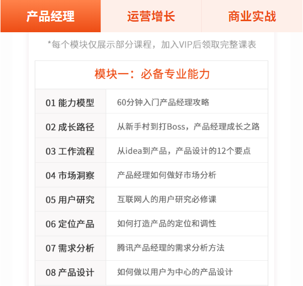 作为一套专门为产品、运营人成长设计的体系化成长方案,在历时5年的打磨、升级和迭代之后,已有超过1000小时的产品、运营领域专业课程,并构建了VIP专属七大特权体系,能更好地帮助你全面、高效地实现专业能力成长。