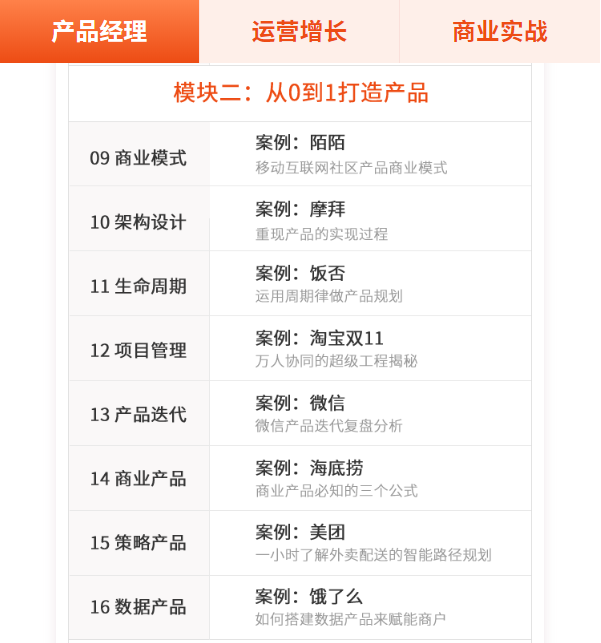 海量知识点,如今被梳理成产品、运营、商业三大专业板块,提供推荐课程表作为学习指引,可以帮助新人小白、野路子重新构建自己的专业认知体系。