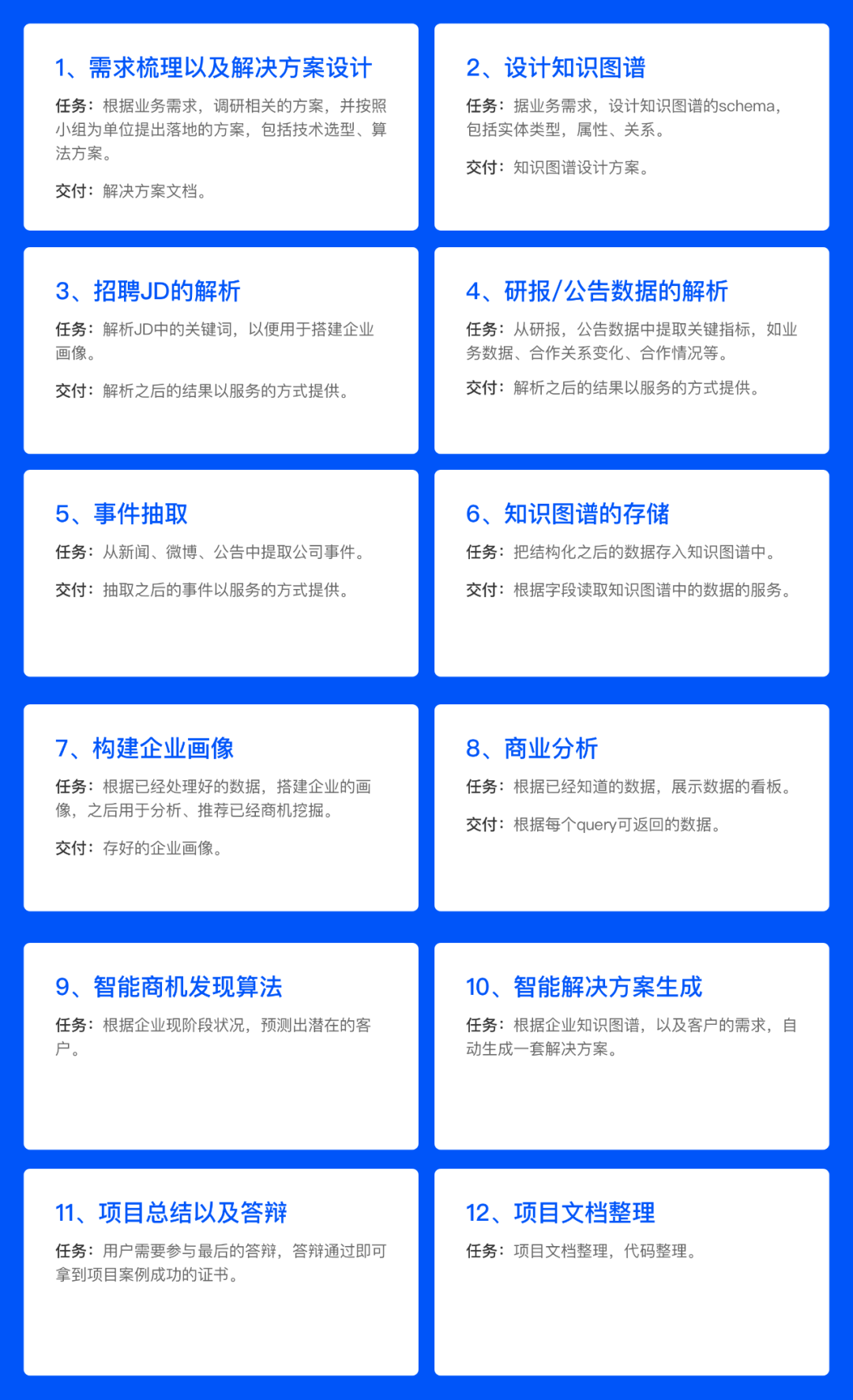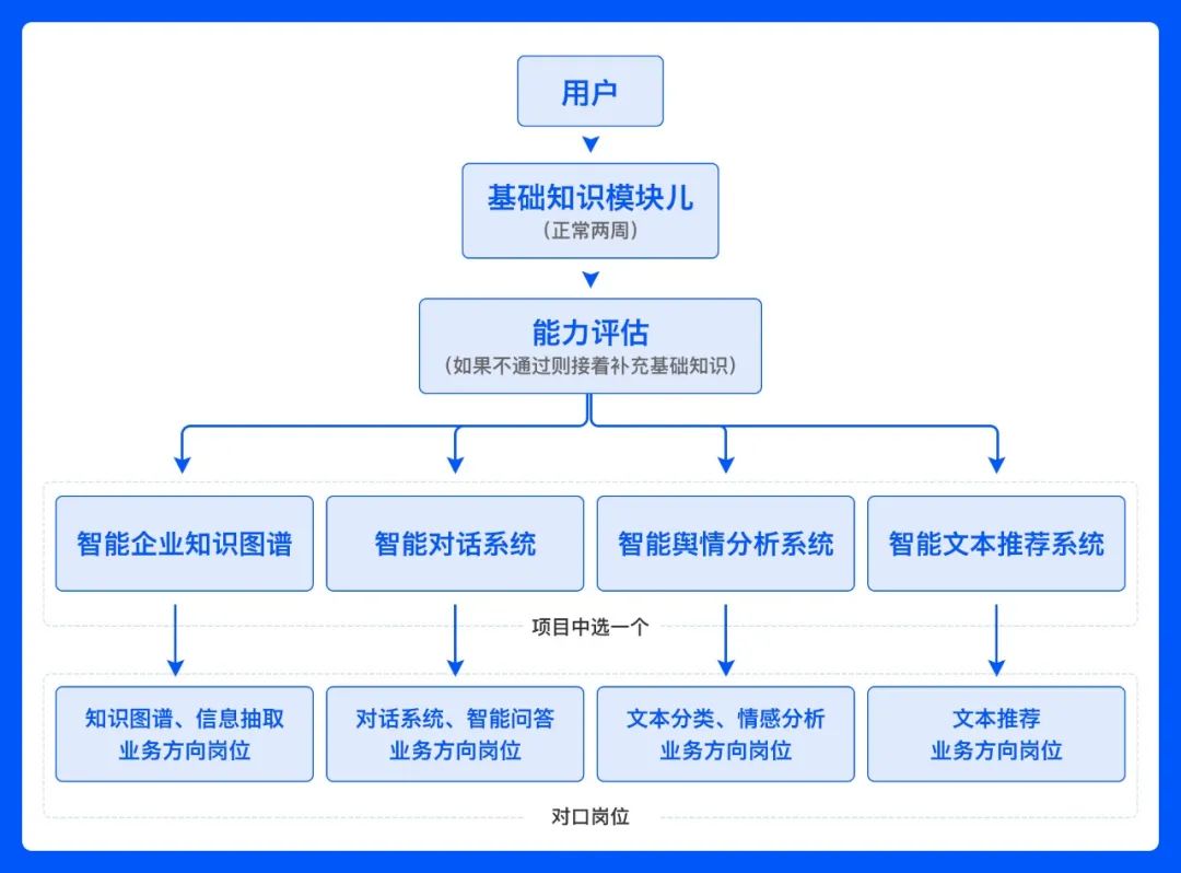 本NLP项目式培养方案分为智能企业知识图谱、智能对话系统、智能舆情分析系统和智能文本推荐系统,学员可以根据自己想要进入的岗位来选择参与某一个项目。