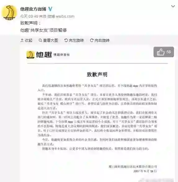 9月18日上午,在“共享女友”项目被罚款后,他趣发布声明称,将暂停“共享女友”项目的运营,并下线他趣App内共享娃娃的入口。他趣方面称,对于已经完成预定并交纳押金的用户,将全数退回押金和费用,并赔偿双倍费用作为违约金。。