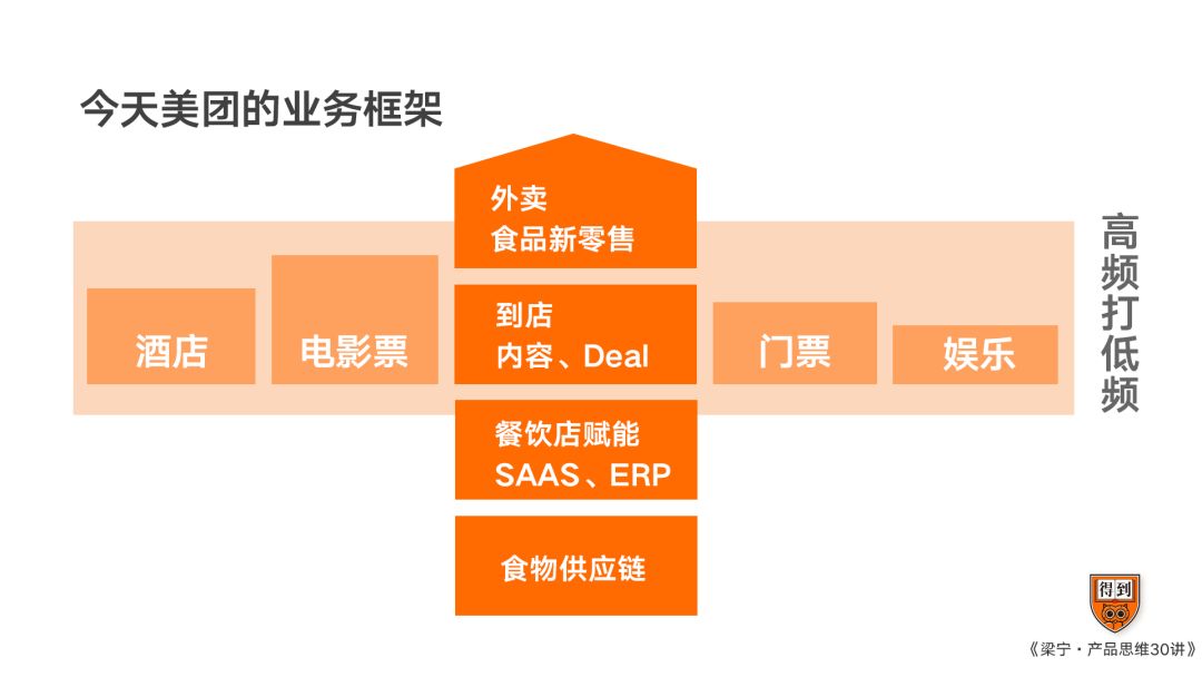 在美团酒店订房的人,70%没有安装携程,但80%在美团订过餐或者电影票。确实,吃饭看电影比开房高频多了。但是用户有了这个心智的印象,知道美团可以订酒店,到需要的时候,就可以在一个App搞定。
