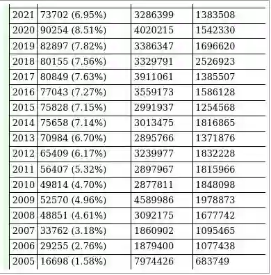 2021年,有4421封不同的电子邮件与Linux内核代码提交有关,比2020年的4603封有所下降,但与2019年的4383封相比又有所增加。
