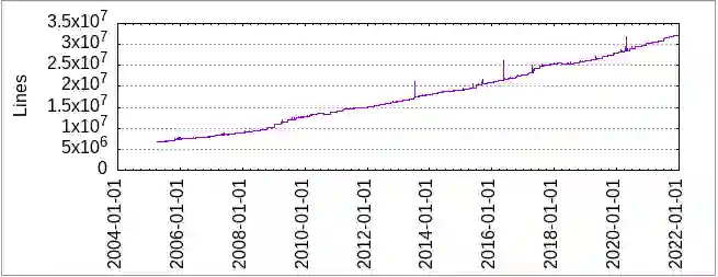 截止至2021年12月31日,在Linux内核源码树上运行GitStats时,可以看到约有24.3万个作者进行了1,060,172次提交。该源码树目前由3,220万行的代码组成,涉及74,300个文件。