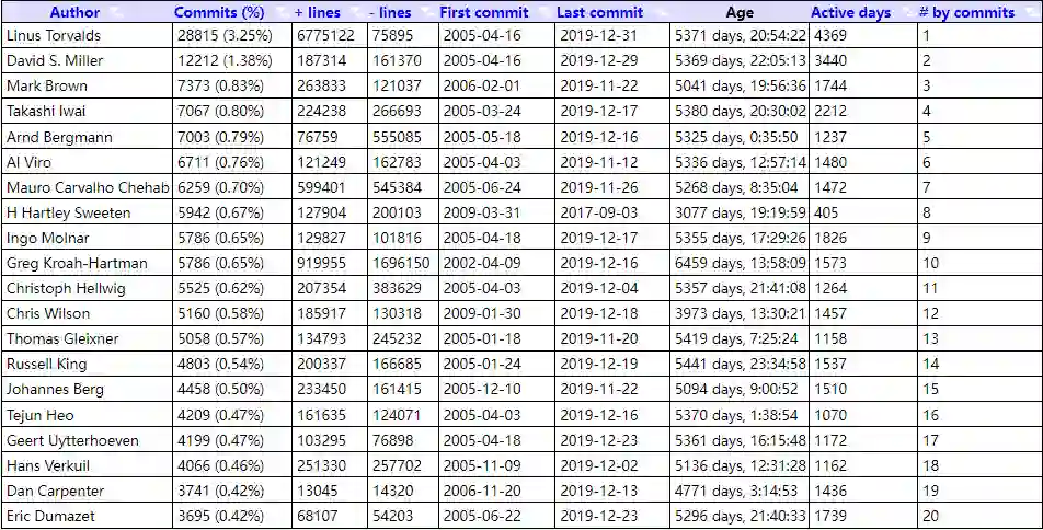 像以往一样,Linus Torvalds依然还是Linux源代码树上最高产的贡献者。除了他之外,Linux内核源码树上,排名靠前的代码贡献者分别是David S. Miller、Arnd Bergmann、Christoph Hellwig、Lee Jones和Jakub Kicinski等知名的长期内核贡献者。