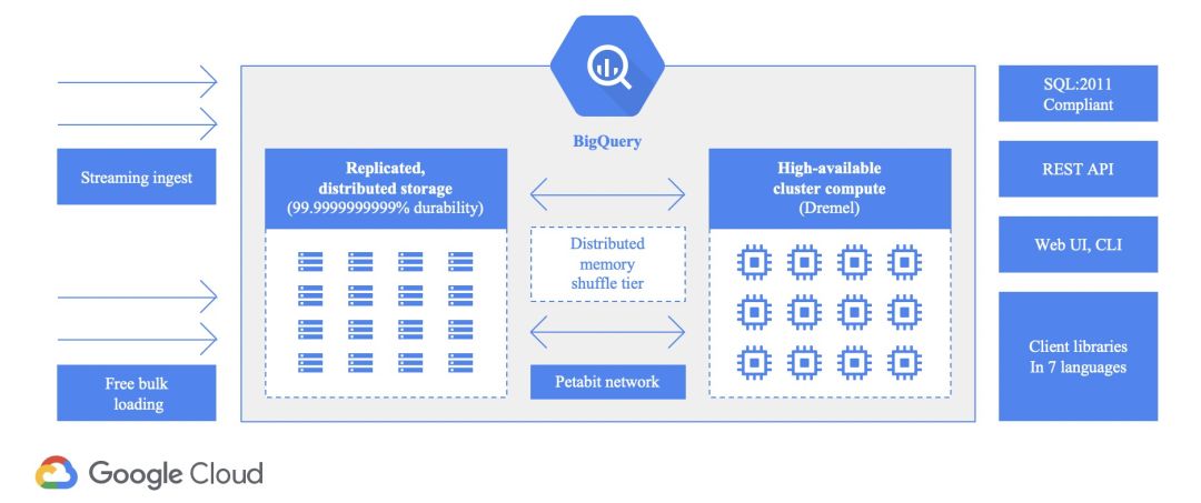 支持实时流数据——即使 BigQuery 没有搭配 Dataflow、Pub/Sub,仍然可以通过 Google 提供的 API 把实时数据放在仓库