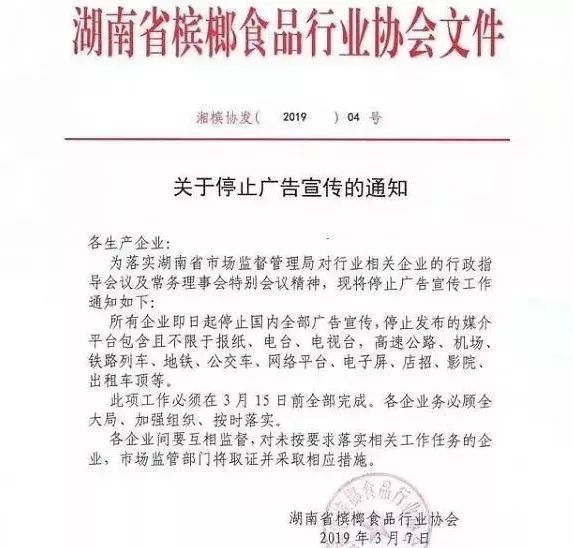 近日,湖南省槟榔食品行业协会下发《关于停止广告宣传的通知》,其中提到所有企业即日起停止国内全部槟榔广告宣传,且必须在3月15日前完成。