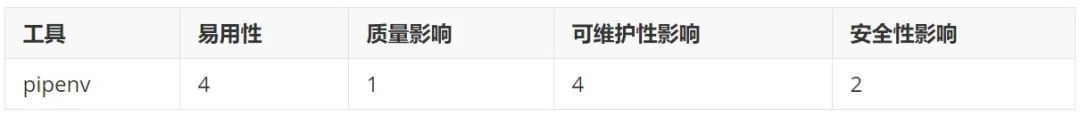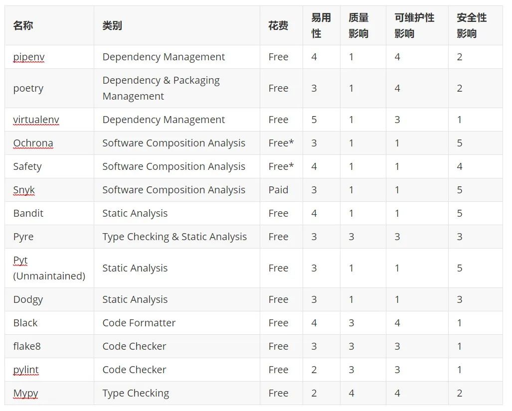 我会列出一些自己最喜欢的 python 工具,并从易用性(是否易于安装、运行和自动化)、质量影响(能否阻止可预见的 bug)、可维护性影响(是否让工作更轻松)和安全性影响(能否发现并阻止安全性问题)对它们进行打分,以供读者参考。