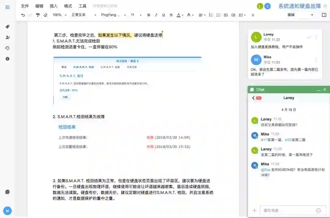 而且成员间可以在文档中用Chat来实时沟通,不需要在文档和沟通软件间来回切换,哪里要改,为什么要改,是不是第一版最好,甚至通过Chat开启视频会议……大家当着Chat的面把想法聊清楚。