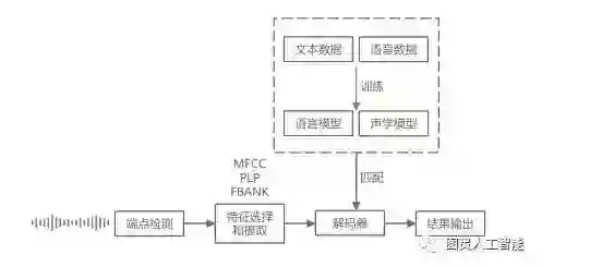 语音信号经过前端信号处理、端点检测等预处理后,逐帧提取语音特征,传统的特征类型包括有MFCC、PLP、FBANK等特征,提取好的特征会送到解码器,在训练好的声学模型、语言模型之下,找到最为匹配的此序列作为识别结果输出。